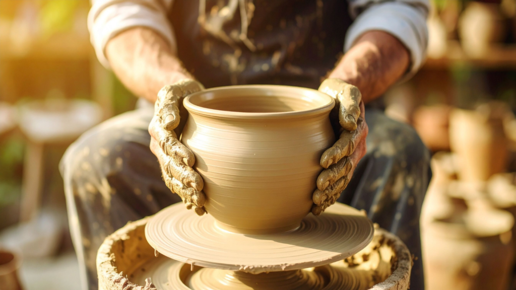 Crochet, embroidery, ceramics, handmade jewelry, woodworking, and other craft traditions where creators shape materials with their hands.